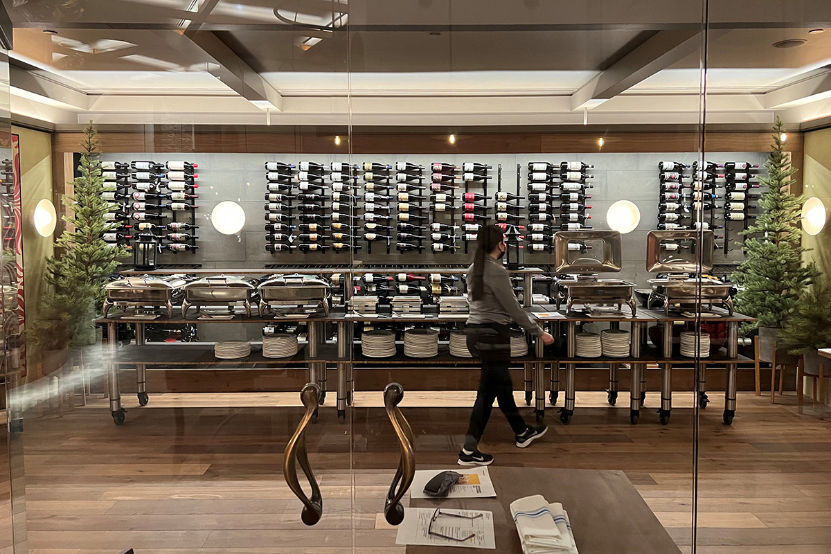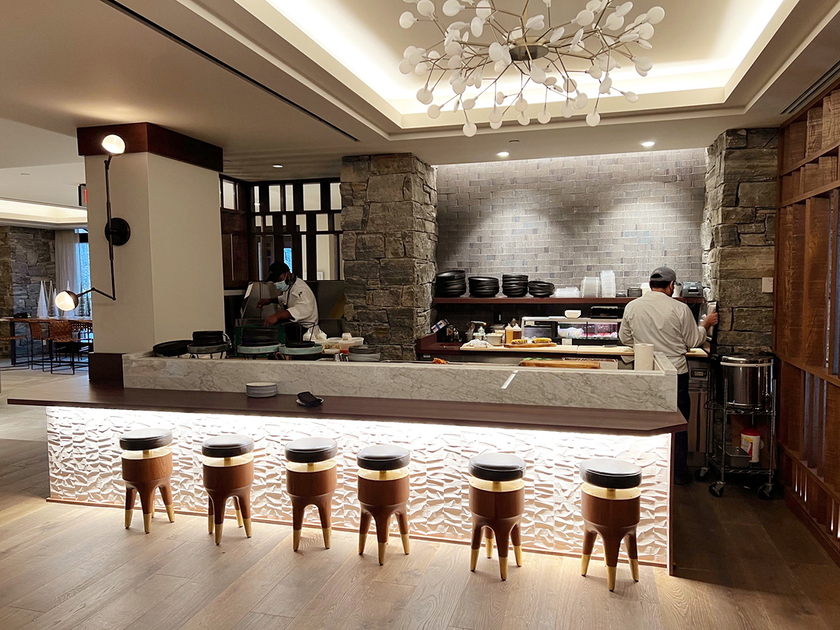 The new kitchen features an additional 15 feet of cook line, reconfigured access to the dining areas, and an expanded display kitchen that provides diners an elevated culinary experience. The kitchen also serves as the center for room service and Spruce Peak Village catering.