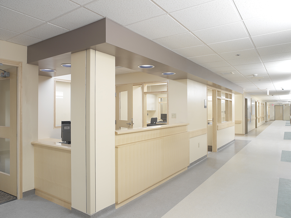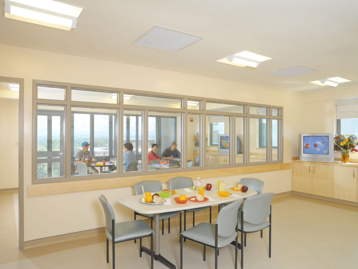 The two wings (one open and one secure) are designed to be safe and durable while offering a comfortable and home-like setting. The spaces provide accessibility and offer patients opportunities to socialize. The project includes several large, open activity spaces and lounges, and a team station gives patients better access to staff. The secure unit has a secure balcony with views of Mt. Mansfield, and a dedicated outdoor space allows patients to participate in outdoor activities in a private setting.