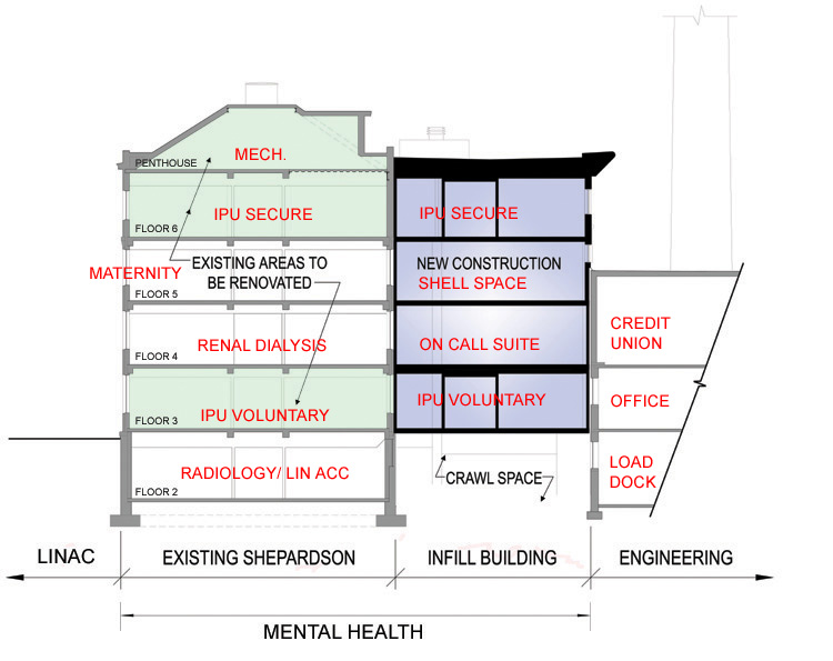 As Associate Architect with Tsoi-Kobus of Boston, MA, FFF designed this complex, four-story addition to connect the new inpatient psychiatry facility to existing floors at the UVM Medical Center. Half of the 28-bed unit is a renovation of the 1941 Shepardson wing, and the other half is a courtyard infill that abuts existing structures.