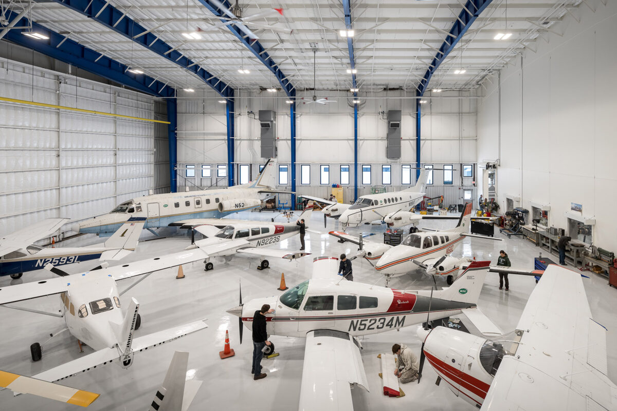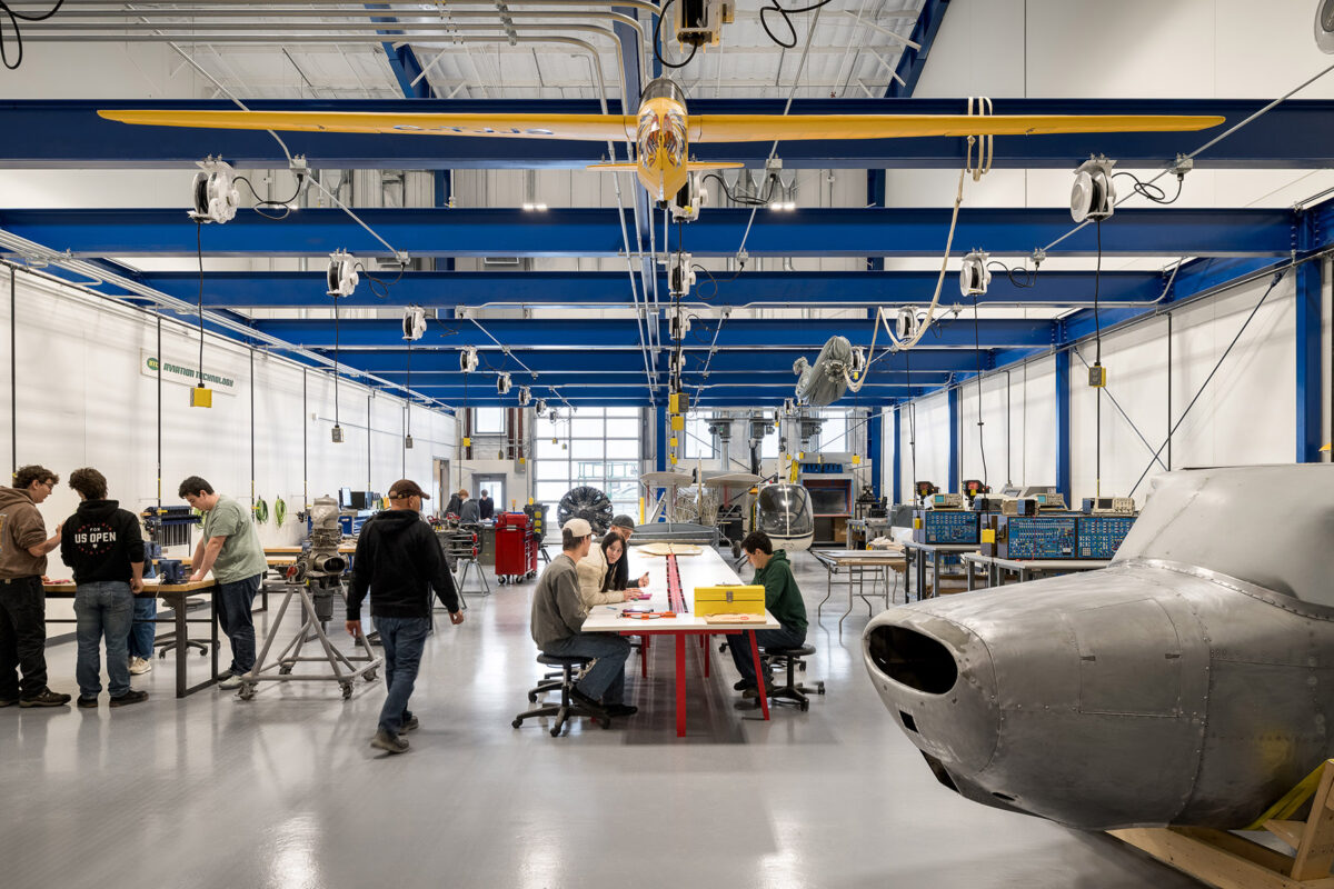 The project occupies a repurposed hangar that sat vacant for many years before undergoing a complete transformation into a state-of-the-art educational facility. The renovated space includes teaching labs and classroom space for four programs: aviation and aerospace technology, airframe and powerplant technology, automotive science and technology, and advanced manufacturing. Largely funded by federal dollars, the facility complies with Buy America, Build America (BABA) guidelines and meets FAA Certified Part 147 program requirements.