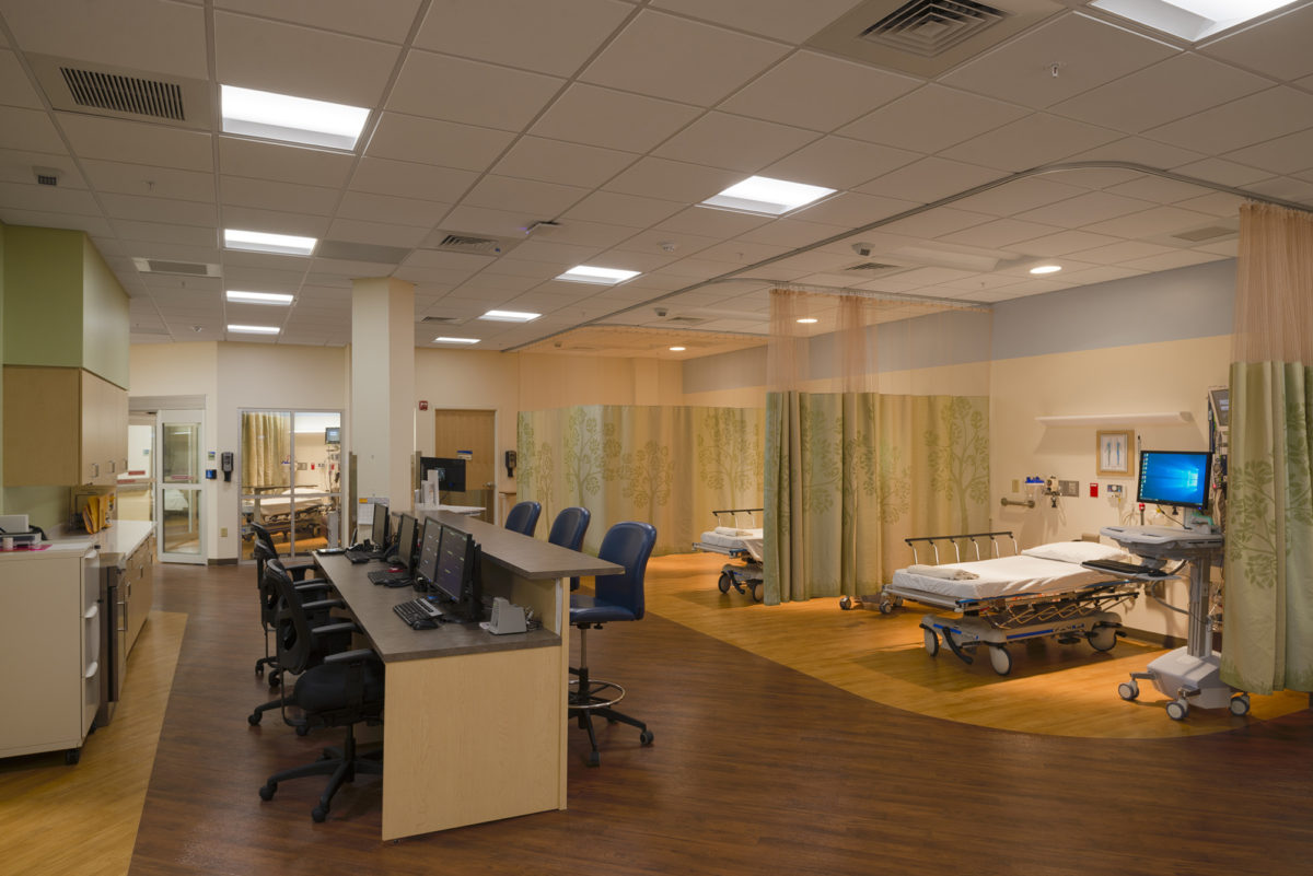 Two replacement procedure rooms, required by 2014 FGI standards, are supported in the design, as is a dedicated waiting room for patients’ families.