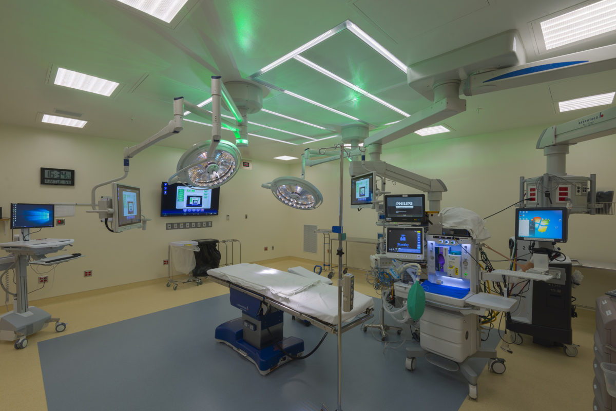 The suite includes a total of 19 pre- and post-op beds including six post-anesthesia care units and dedicated beds for bariatric and pediatric patients. A back-of-house corridor allows surgeons to access locker rooms in street clothes, gown-up, and enter the semi-restricted central core in protective attire.