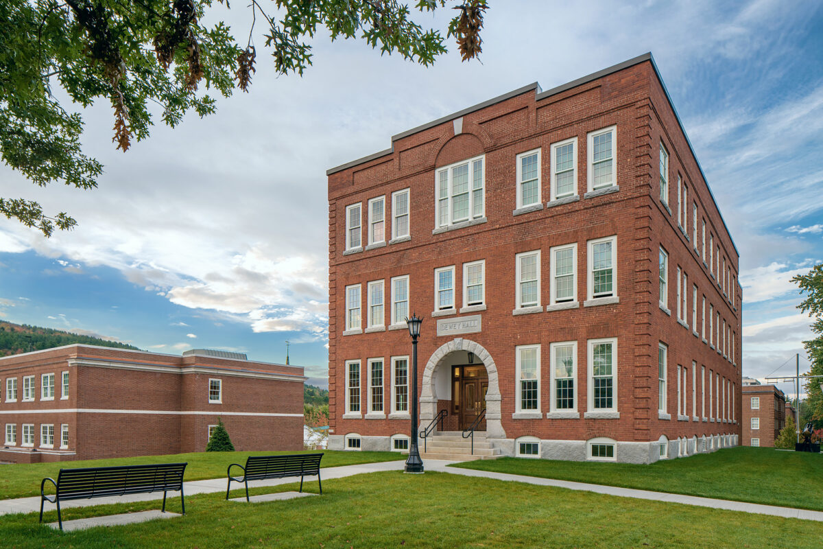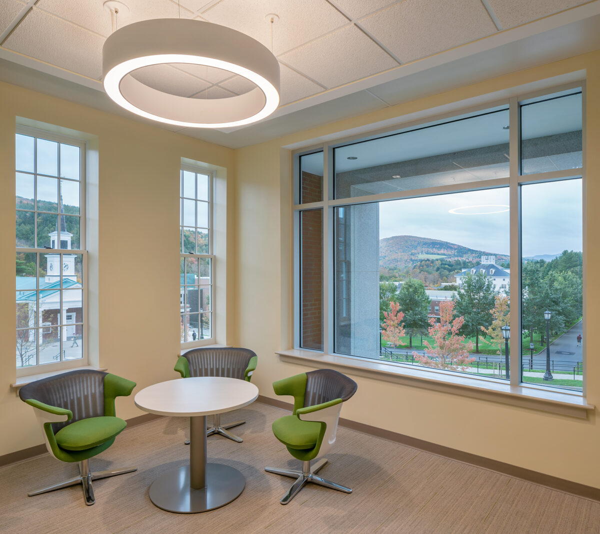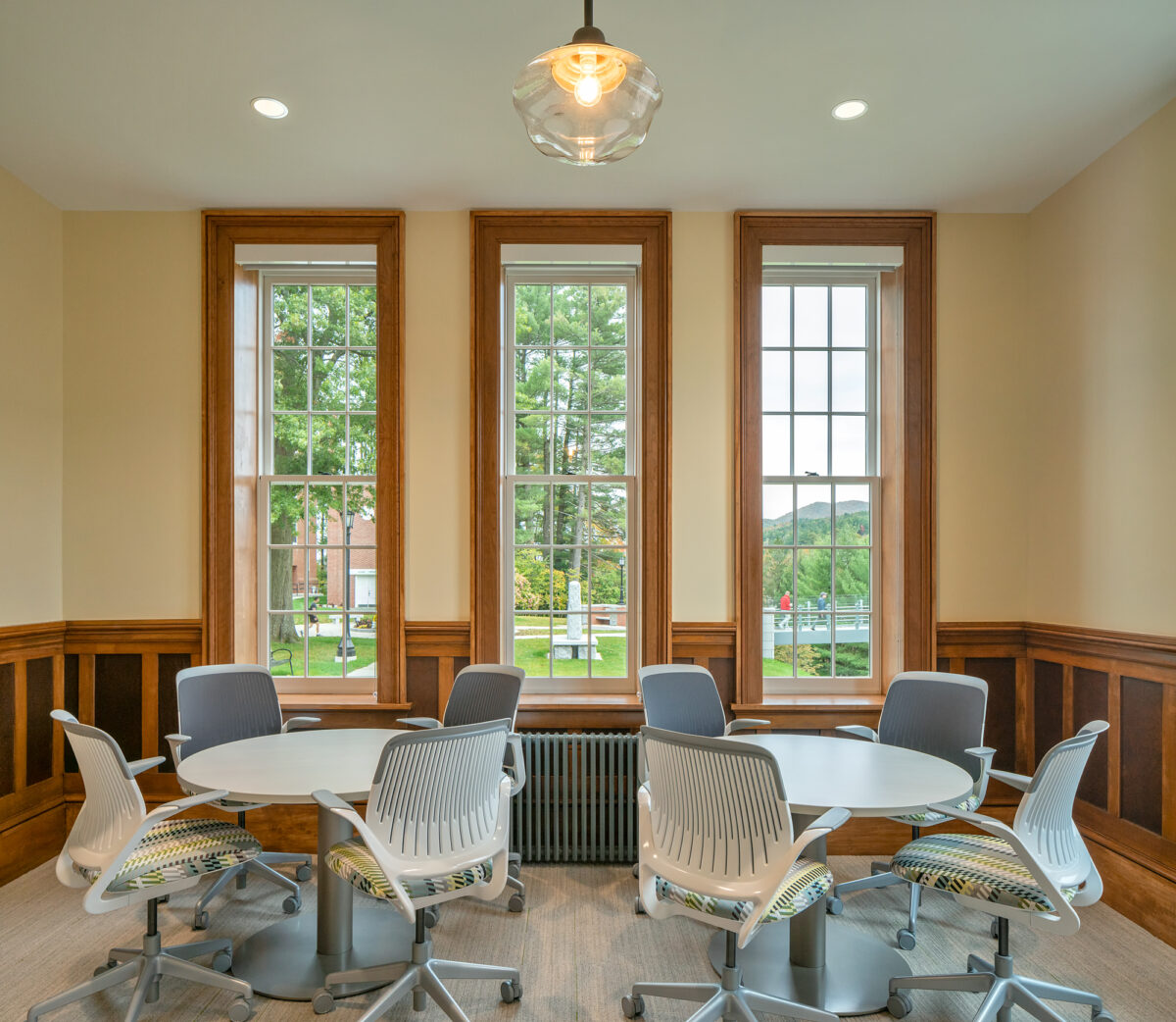 This latest renovation to Dewey hall called for both interior and exterior improvements. Outside, we removed the existing south entrance and replaced it with a new addition that includes stairs, an elevator for ADA access, and lounge space that takes advantage of striking mountain views. The new south-facing facade better relates to the historic north entrance and restores the architectural character appropriate to its prominent site on the campus green.