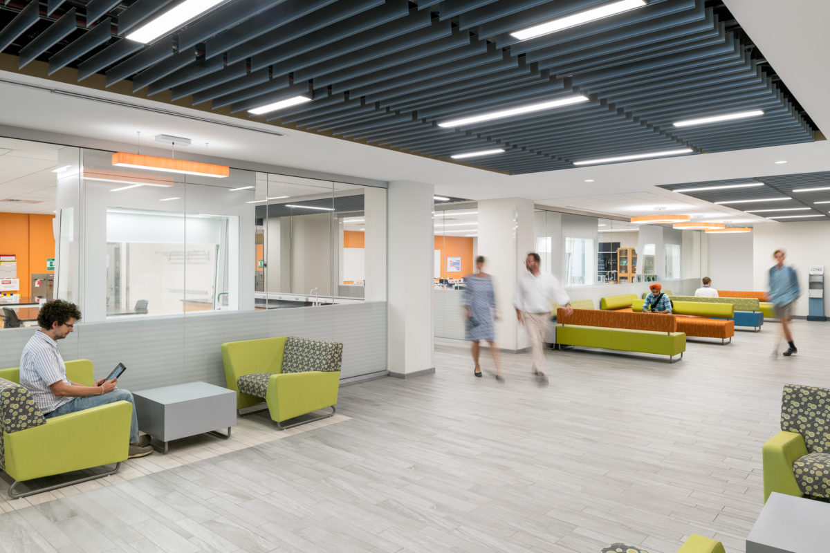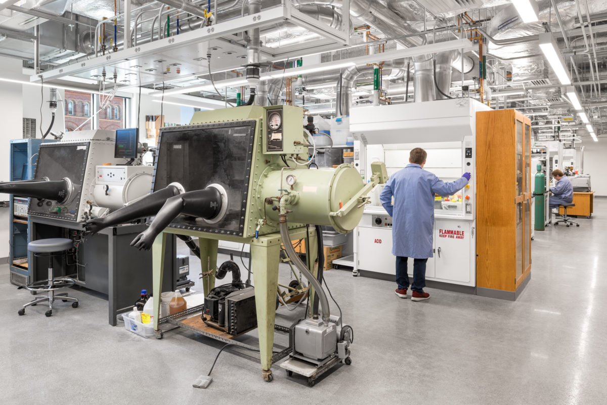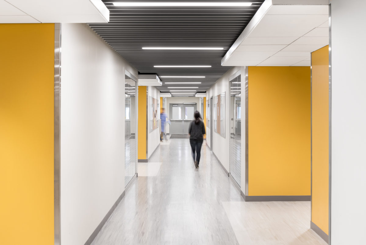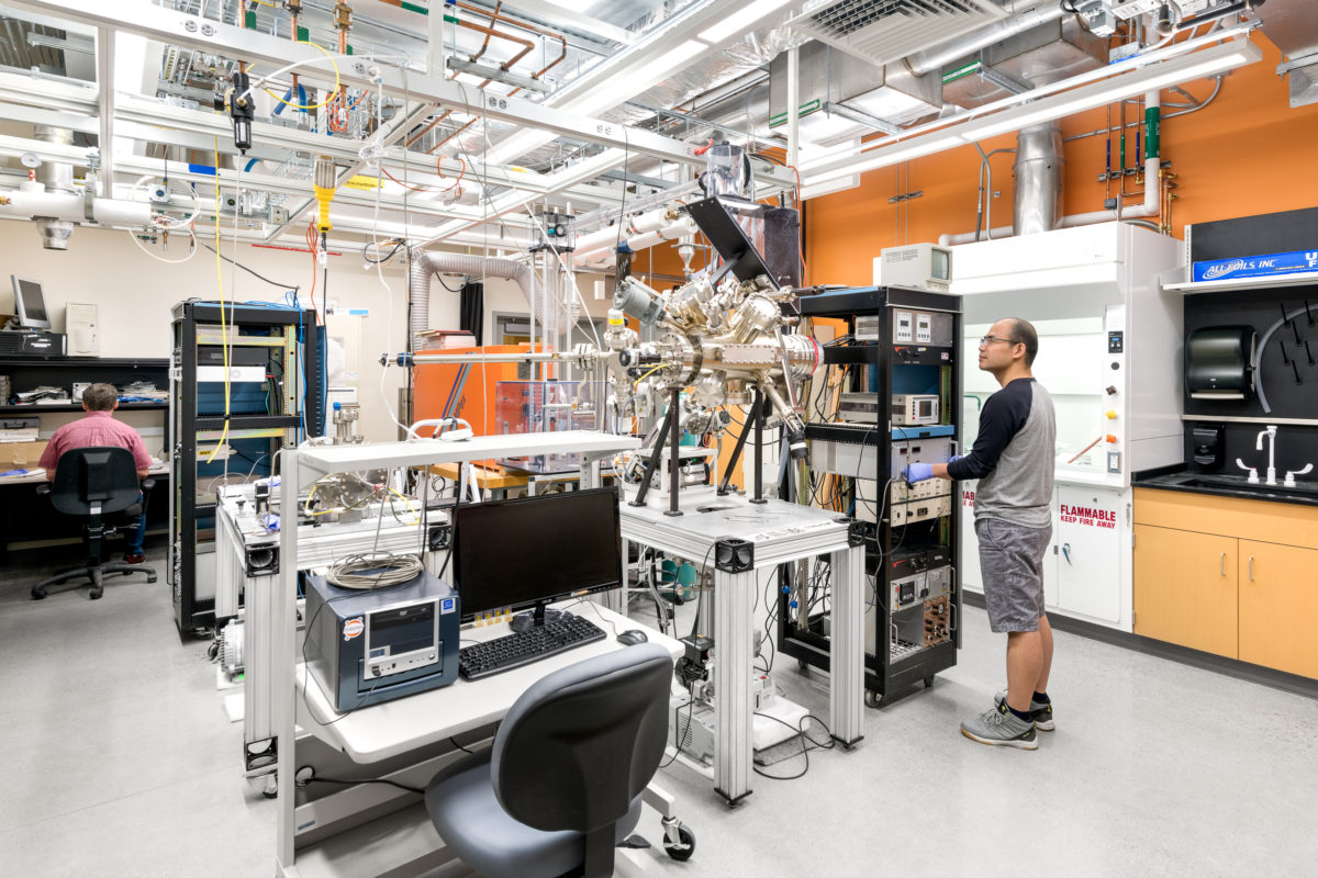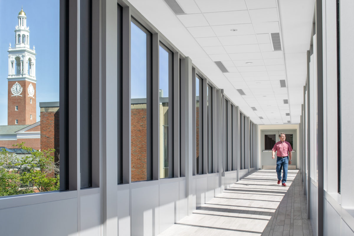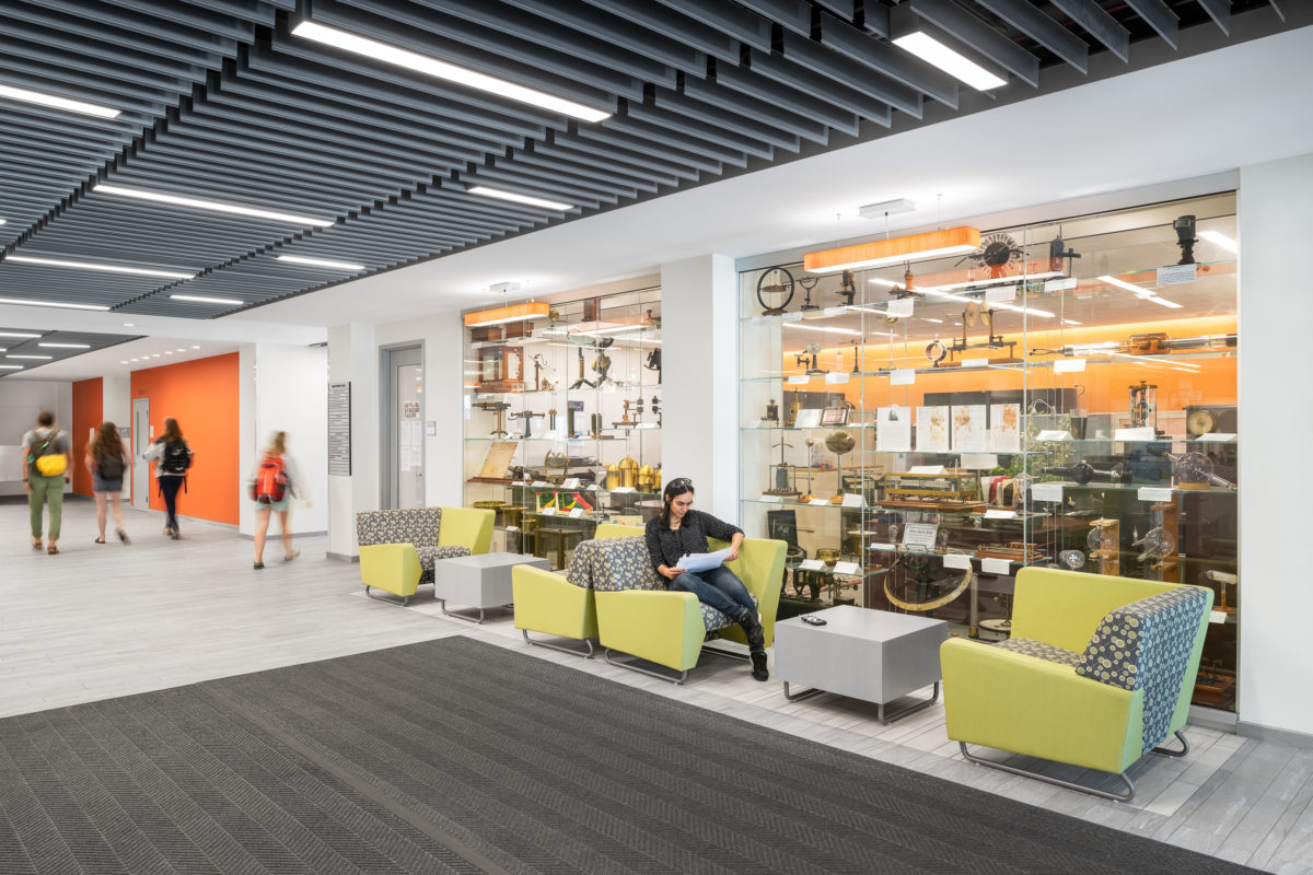 Labs and research spaces are spread across Discovery Hall’s five levels. The basement and first floor were optimized for low vibration levels, which are crucial for sensitive electron microscopy and laser spectroscopy research as well as the state’s only open-research clean room. The upper three floors are a mix of teaching and research labs, offices, and study areas, all shared by physics, engineering, and chemistry to facilitate collaboration and cross-disciplinary learning. Mechanical systems in the penthouse include cutting-edge ventilation and heat-recovery systems to minimize energy use.