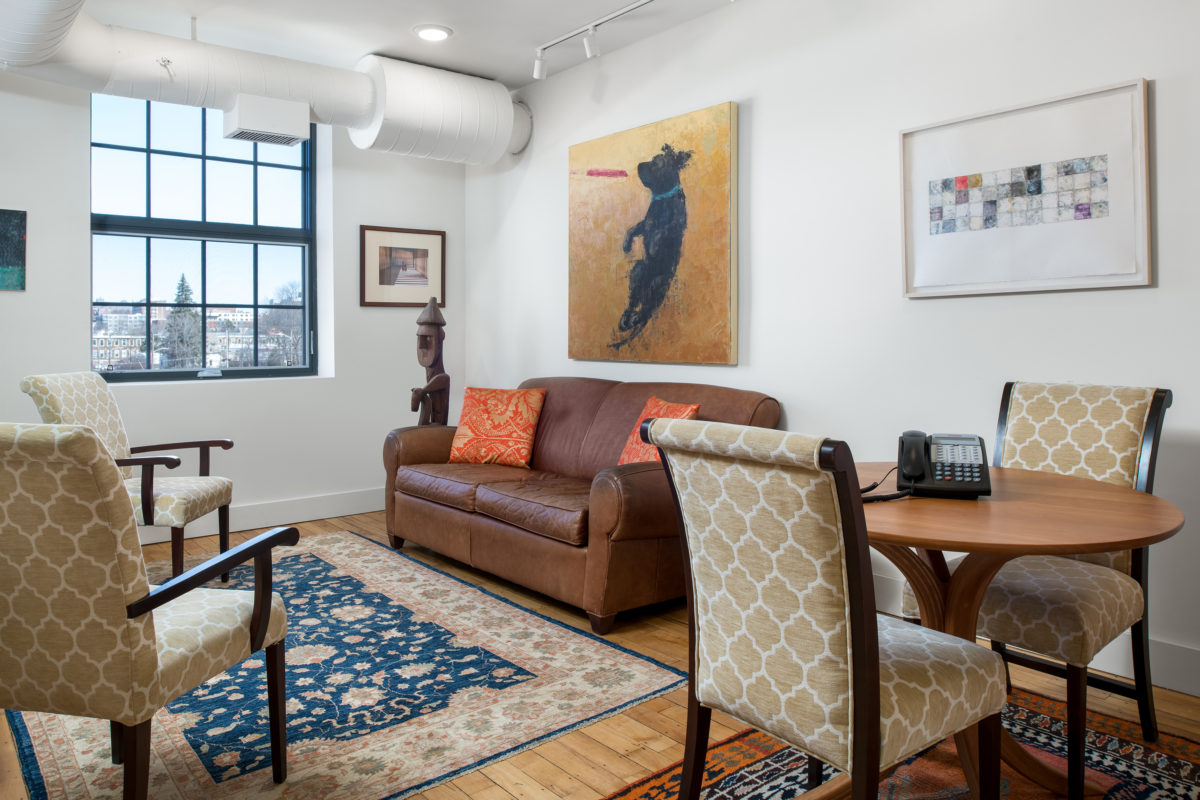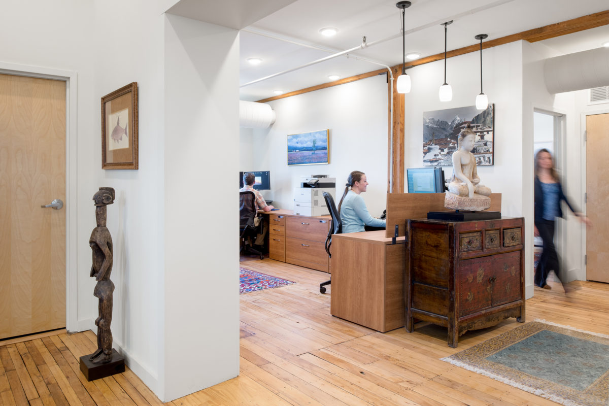 The innovative plan converted a little-used storage room into usable space and moved the reception area and a meeting room to a more client-friendly location with a more prominent entrance. The new layout affords more privacy for confidential client meetings while maintaining the historic character of the 150-year-old building. Key spaces were reserved for the owner’s striking art collection, which features both local artwork and global treasures.