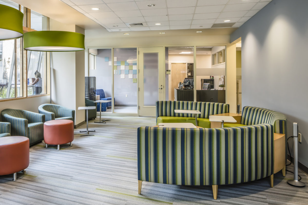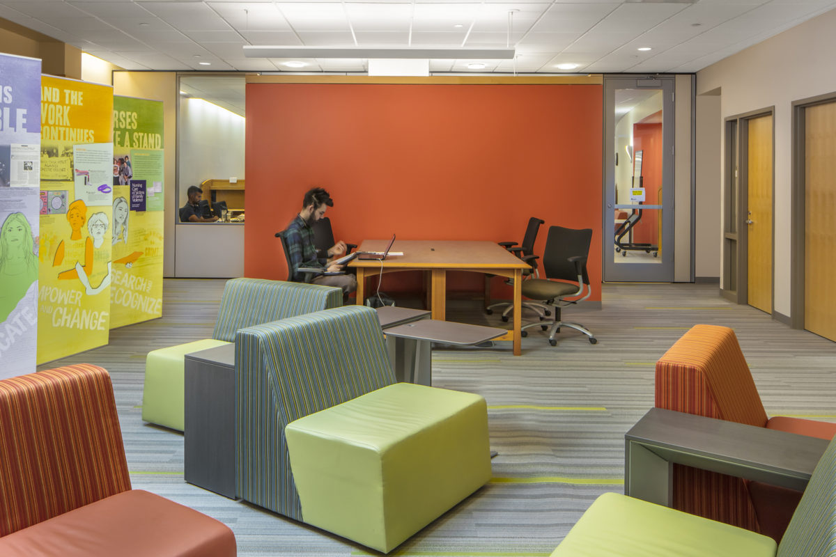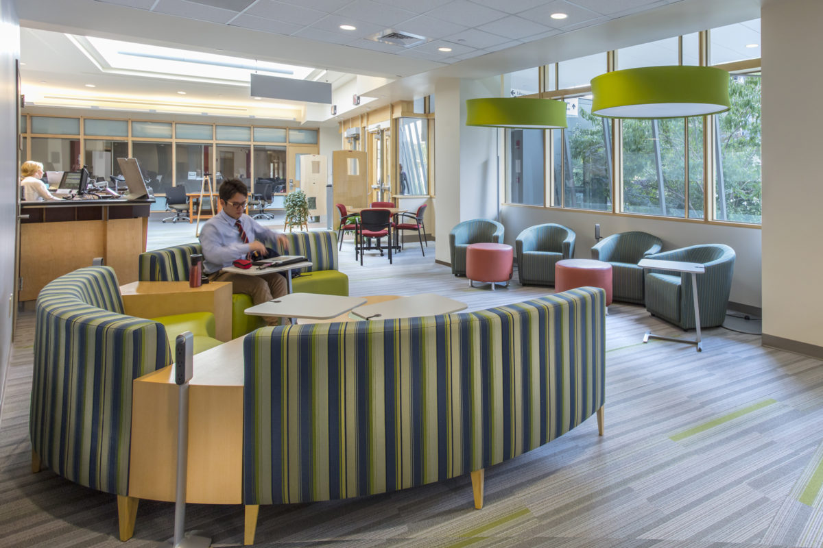 Located within the medical school’s existing library, the commons replaced dated bookshelves and closed offices with open workspaces for group learning, two new quiet study areas, and multiple office suites. Fewer walls and better space planning increase total seating by 25 percent.