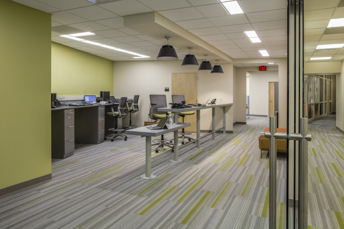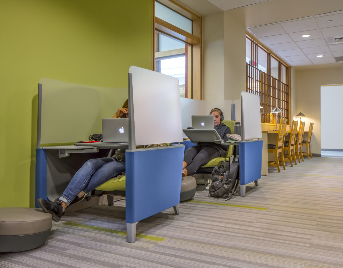 The library’s Information Technology team are front and center in the new space. IT staff are available to work one-on-one with faculty for training in new instructional techniques. Students can ask research questions and get guidance on the vast electronic resources available to them.