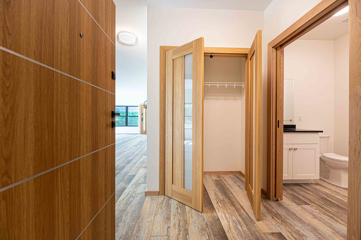 Each unit features a full kitchen, one or two baths, and a washer and dryer. An ancillary storage building provides room for bicycles and outdoor equipment.