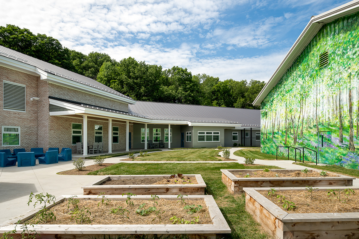 Located in the Woodside Natural Area, the aptly named River Valley Residence is surrounded by nature on all sides. Front and rear porches allow residents and staff to enjoy the outdoors and reinforce the home-like atmosphere. A secure courtyard features a walking path, gazebo, raised garden beds, and lush green lawns.