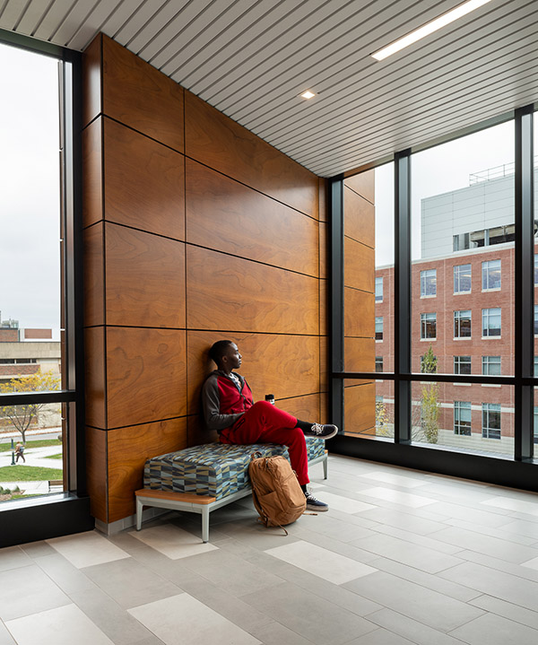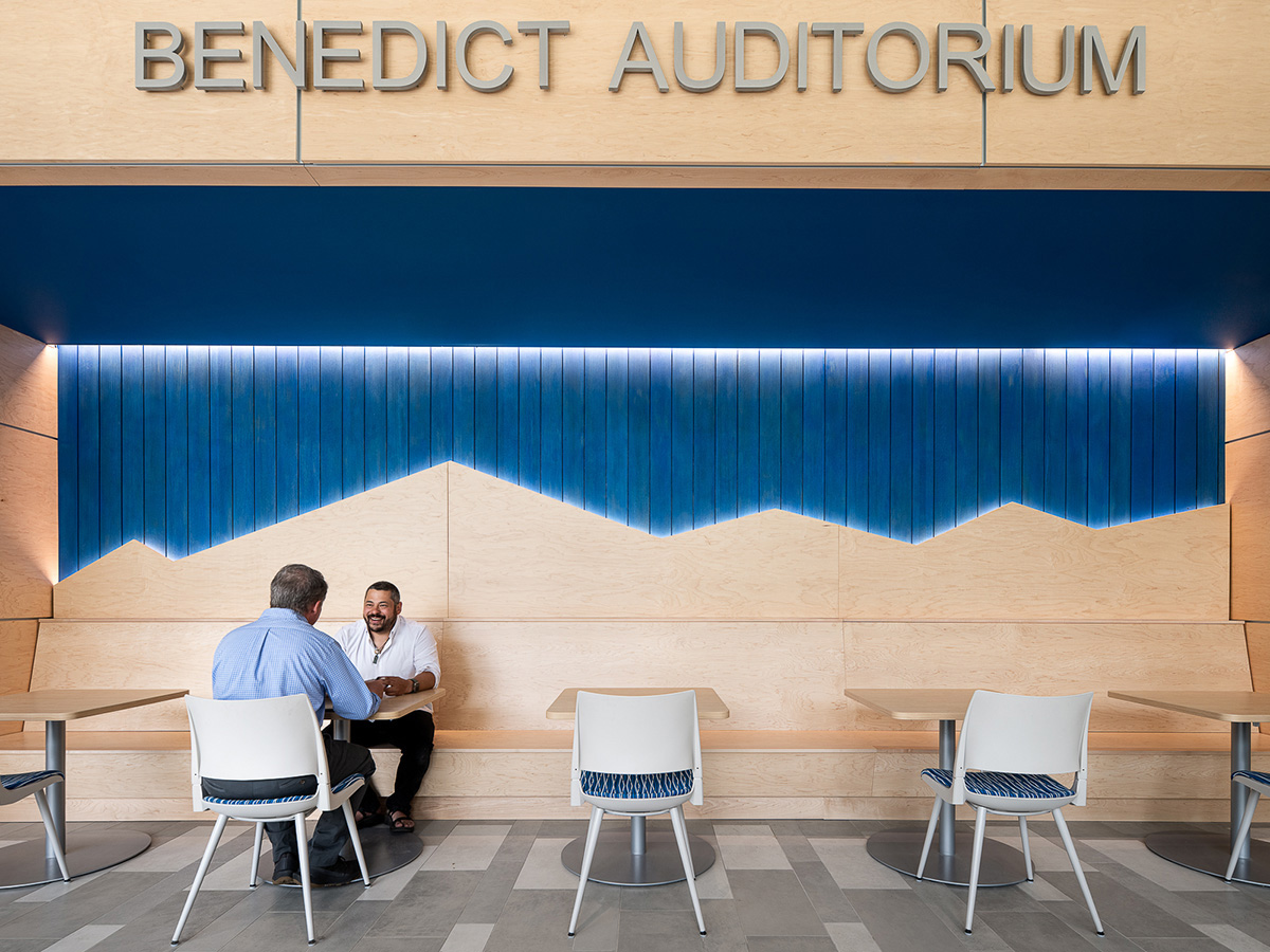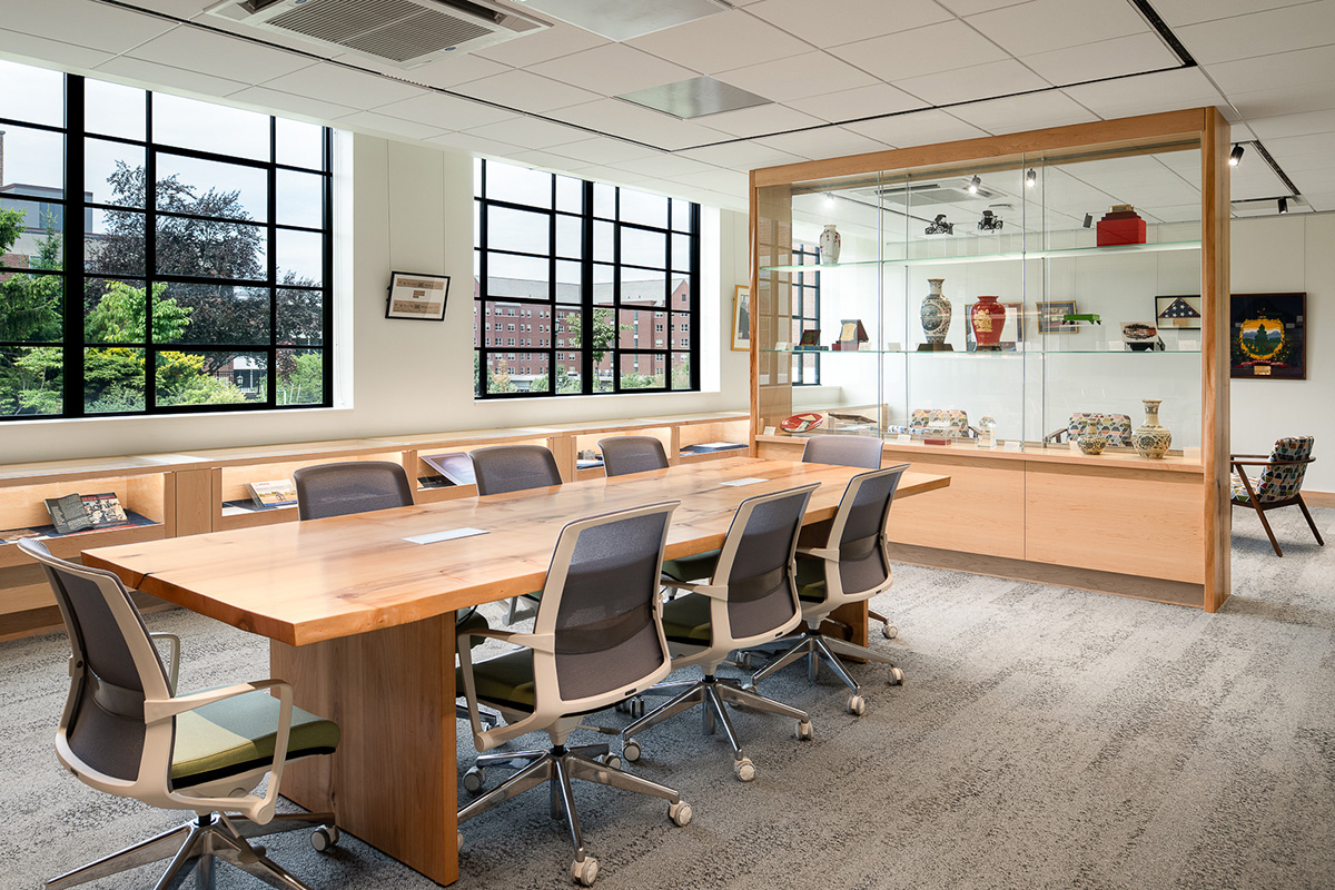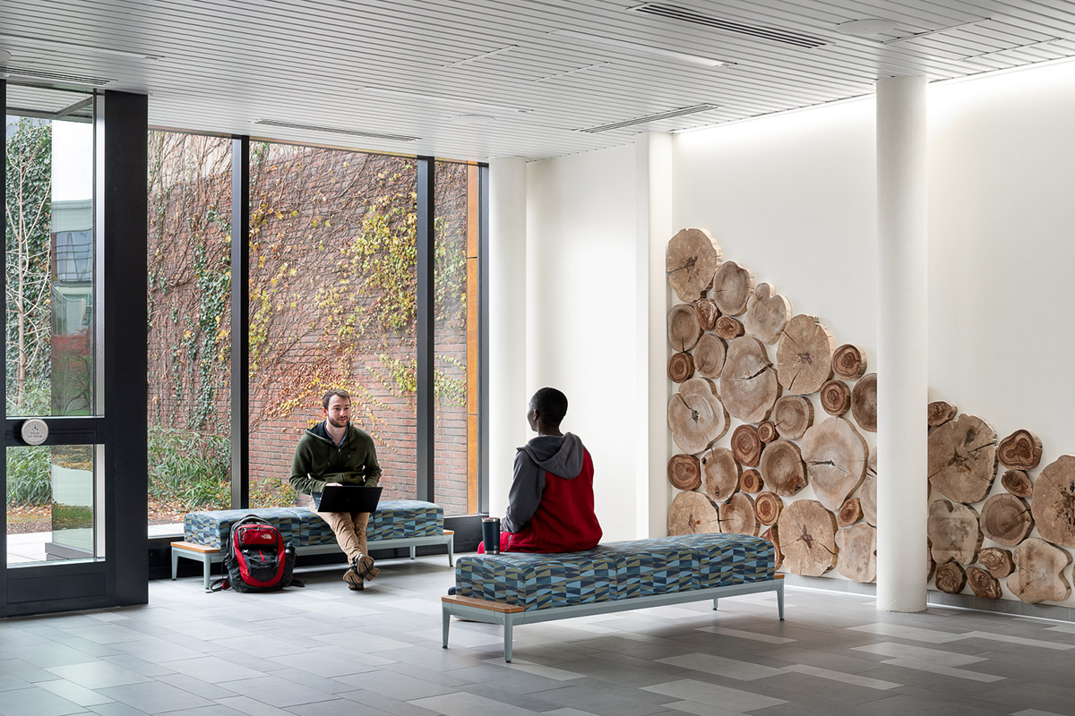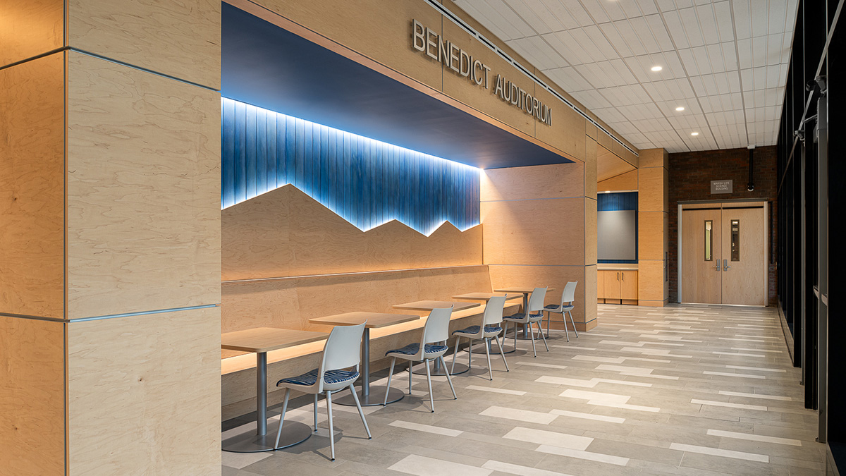 A new connector links the Leahy Building to adjacent Benedict Auditorium and a new north entrance and elevator tower addition provides ADA accessibility on the steeply graded site.