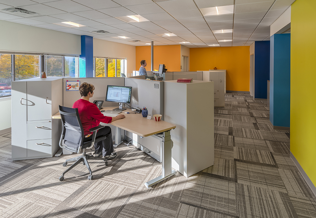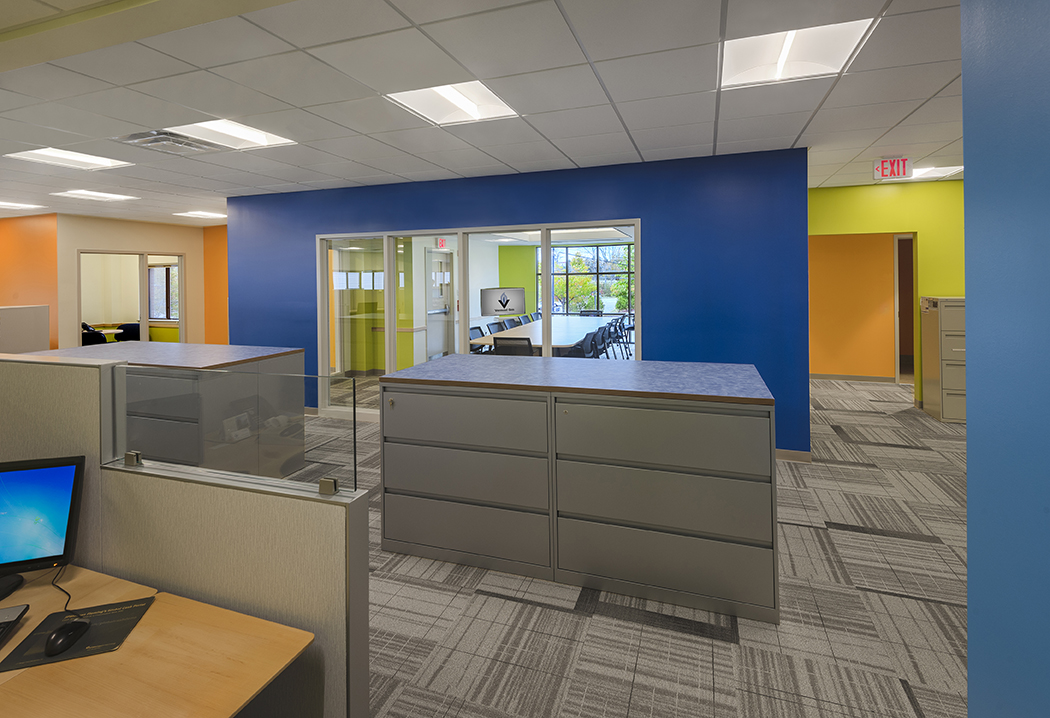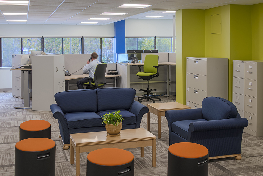 The completely redesigned space meets the needs of multiple groups: managerial and administrative employees, call center operators, service crews, and maintenance staff. Previously closed spaces were opened up for more efficient use of existing space and to encourage collaboration as part of a company-led change management process. The open-office design includes several private meeting rooms and a large conference room overlooking the main entrance. The client chose a palette of bright hues to complement the company’s branding efforts and give the office a modern look.