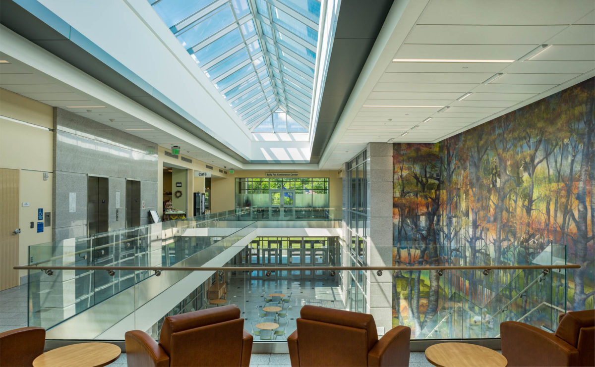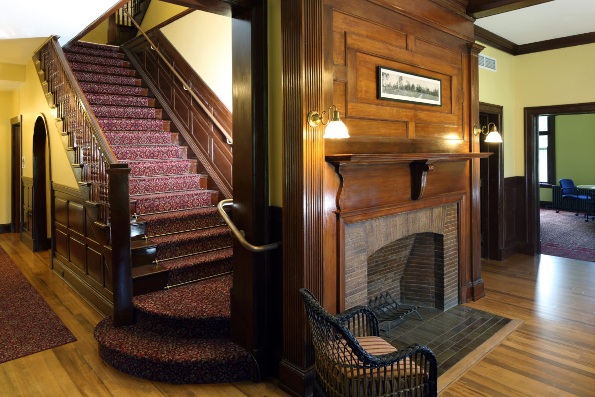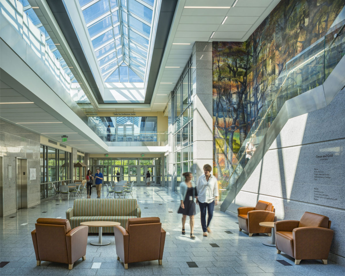 The renovation of the historic core reconfigured existing spaces to meet the demands of the modern workplace while restoring architectural details and finishes. The Center Administration Building regained its elegant porte-cochère, missing chimneys, and grand cupolas. Inside, windows, wood trim, plaster walls, and decorative fireplaces were restored to their original splendor.